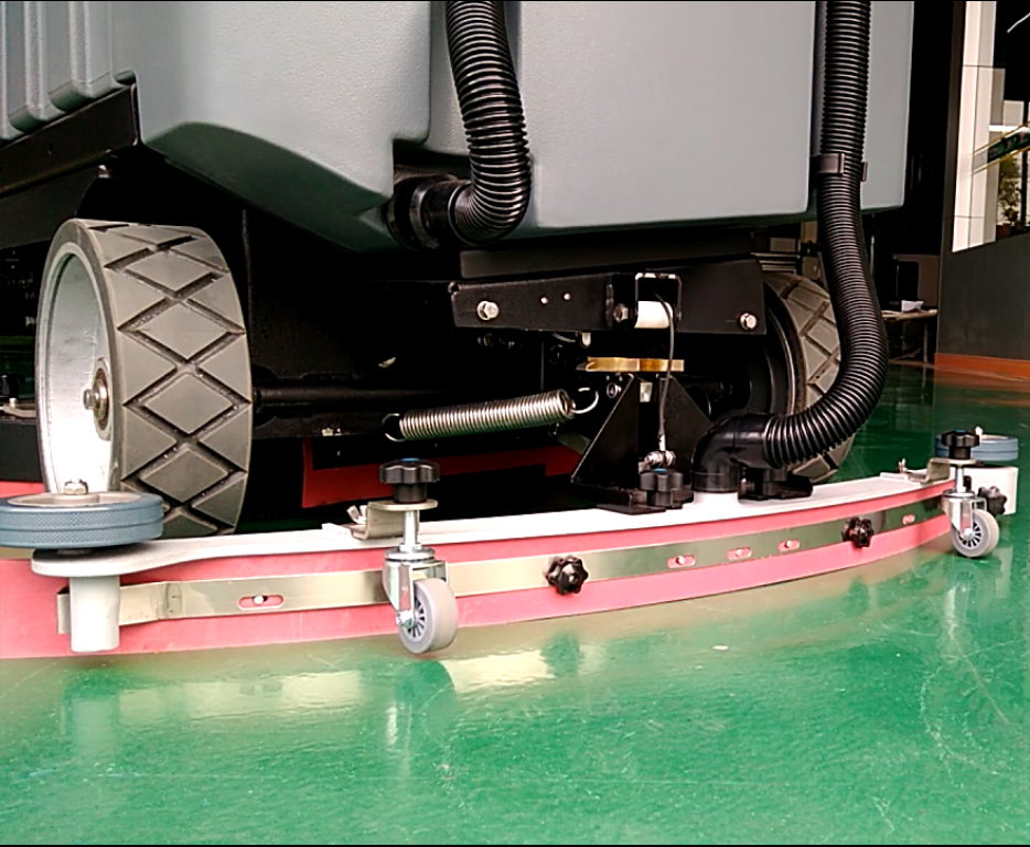 6、更換破損的洗地機刮條,調整洗地機吸水扒的角度,對于正確的使用,洗地機吸水扒應根據洗地機刮條的磨損情況來調節其高度,在清洗的過程中,洗地機后刮條應與地面呈現一定角度。